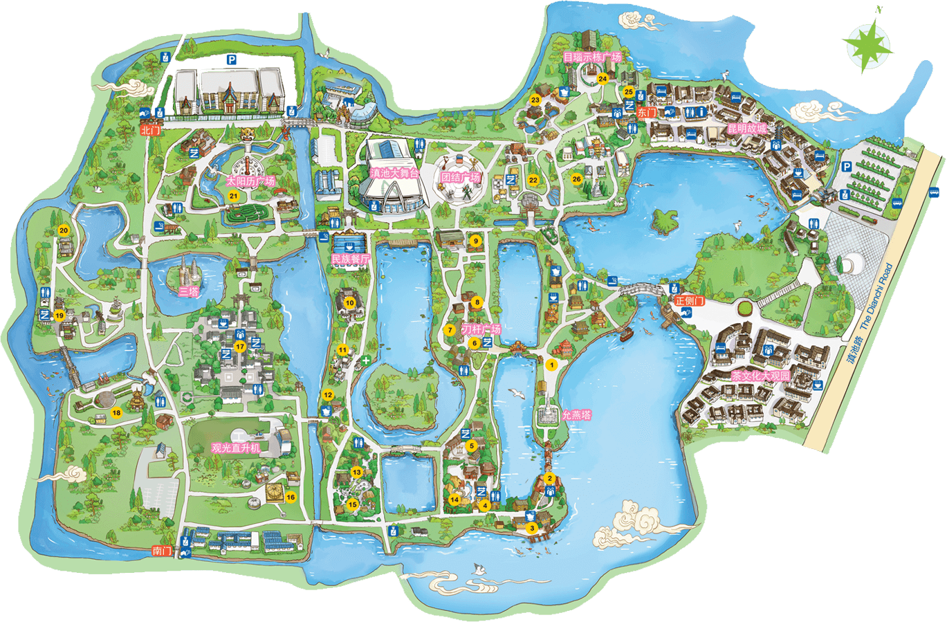傣族人口約107萬人,主要分布在云南的德宏傣族景頗族自治州、西雙版納傣族自治州及瀾滄江流域的河谷壩子區(qū)域。傣族寨是進入民族村的第一個村寨,占地面積27畝,三面環(huán)水,綠樹掩映。一幢幢“干欄式”傣家竹樓,通過蜿延的紅砂石小徑聯(lián)向肅穆的緬寺。巍峨壯觀的白塔,精巧玲瓏的風雨橋,以及風雨亭、水井、鐘亭等建筑充滿著傣家的濃郁風情,是傣寨真實的民間景觀再現(xiàn)。一年一度的“潑水節(jié)”期間,這里都有活潑歡快的“象腳鼓舞...